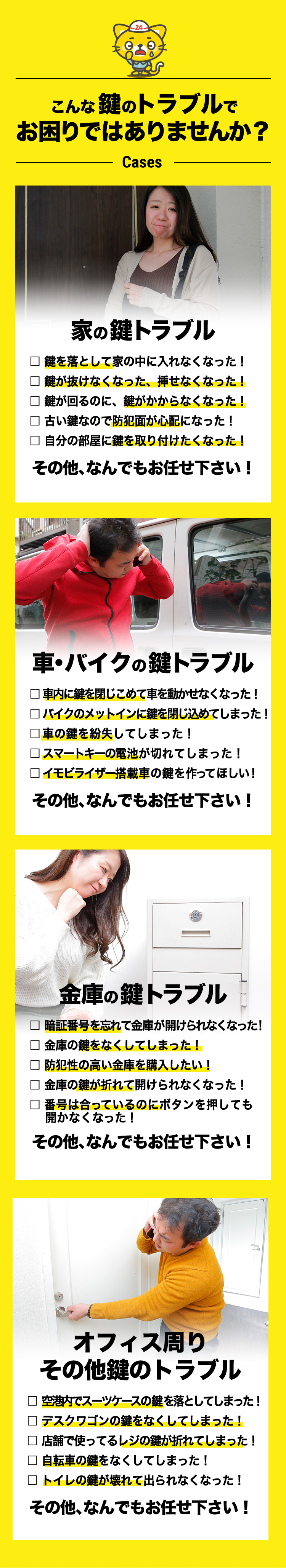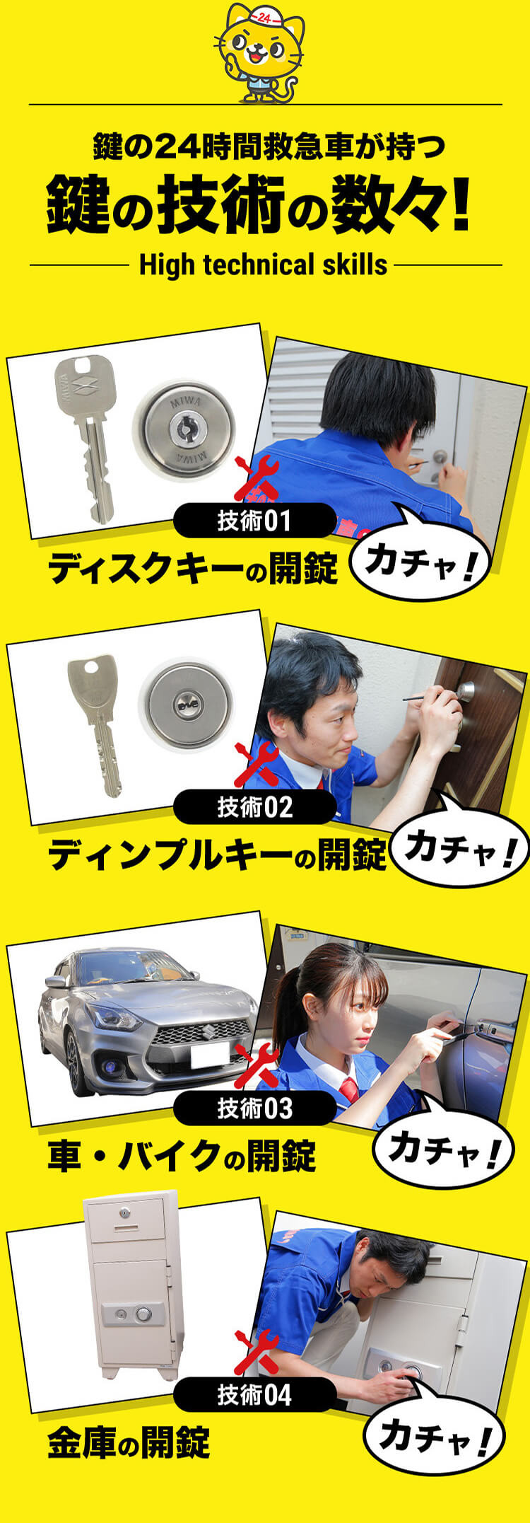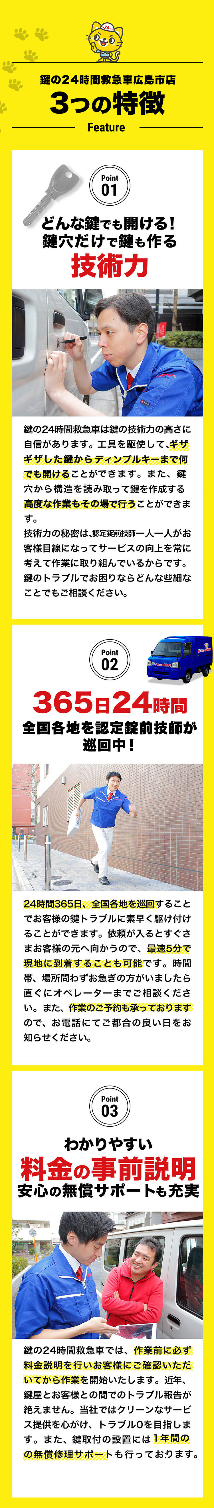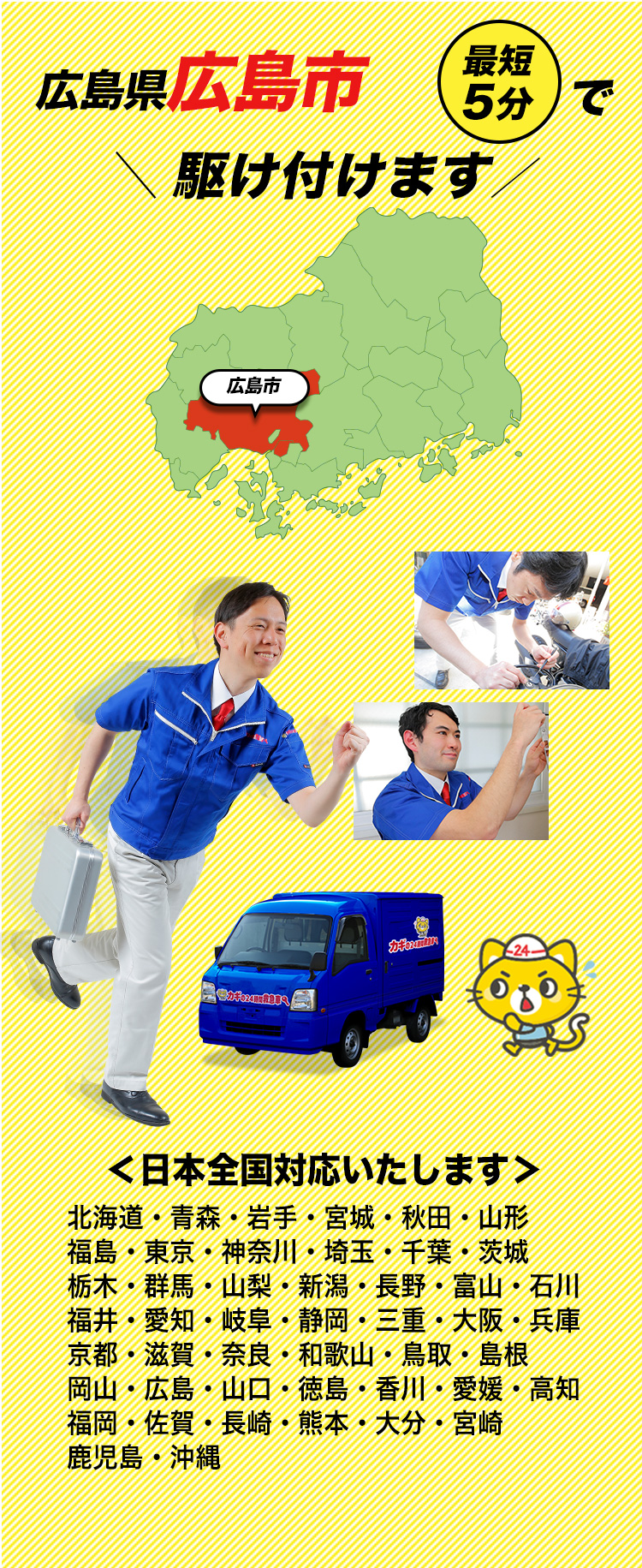 広島市で評価の高い「カギの出張24時間」は中区、安佐南区エリアで速やかにご対応します。透明な事前説明と詳細な見積もりを通じて、お客様の信頼を第一に考えています。地域密着型のサービスで、作業後にはお客様の貴重なフィードバックを活用し、サービスの質を継続的に向上させています。